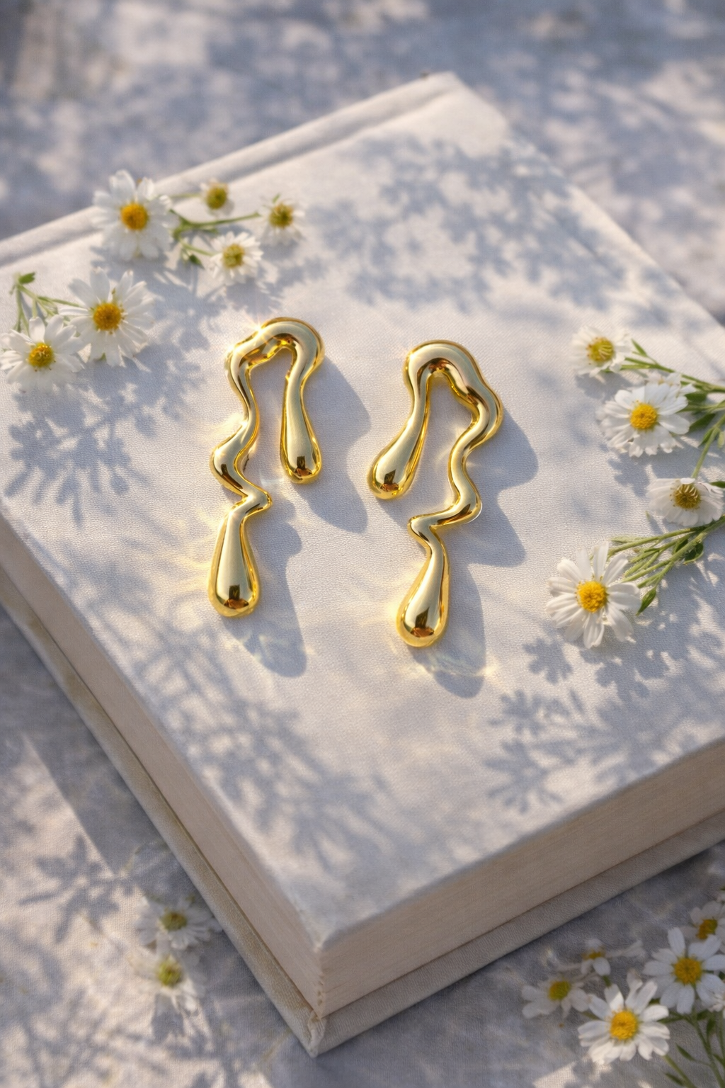 Elegant organic shape dangle earrings with glossy gold finish, lightweight and party wear.